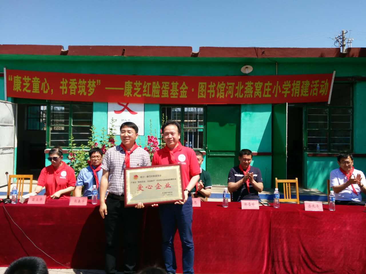 劉總代表公司接受了盧龍縣團委贈送的愛心企業牌匾,以及學?;刭浀腻\旗。