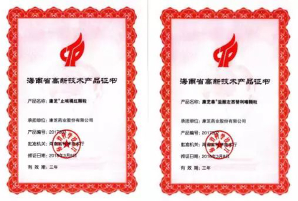 近日,康芝藥業(yè)研發(fā)生產(chǎn)的精品鹽酸左西替利嗪顆粒(康芝泰?)和止咳橘紅顆粒(康芝?),榮獲海南省高新技術(shù)產(chǎn)品榮譽證書,充分肯定了康芝藥業(yè)近年來在產(chǎn)品研發(fā)及技術(shù)創(chuàng)新領(lǐng)域的成績。