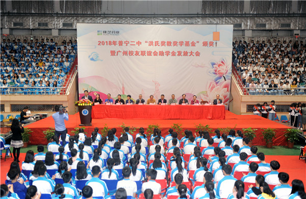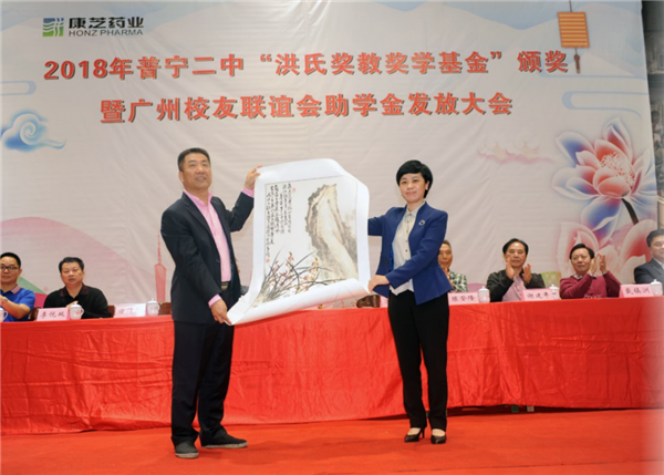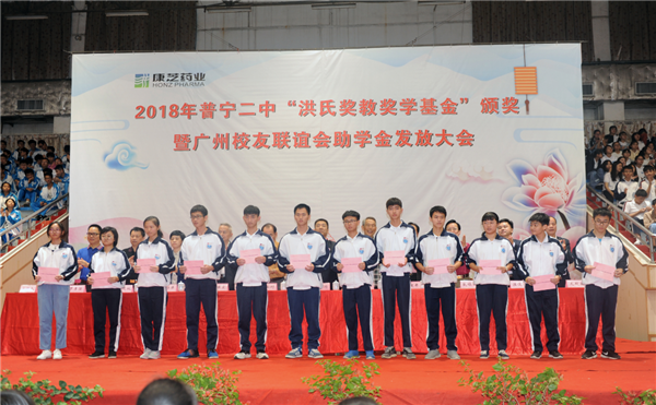 11月5日,2018年普寧二中“洪氏獎教獎學(xué)基金”頒獎暨廣州校友聯(lián)誼會助學(xué)金發(fā)放大會隆重舉行。康芝藥業(yè)董事長、廣州普寧二中校友會會長洪江游先生和受邀校友嘉賓,原揭陽市政協(xié)副主席、普寧二中董事會董事長張伯利先生,普寧市人民政府方錦屏副市長及相關(guān)職能部門領(lǐng)導(dǎo),普寧二中師生參加了頒獎大會。