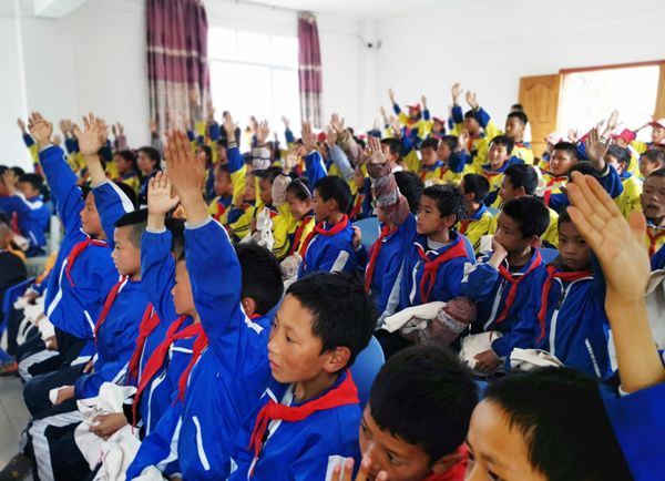 6月21日上午,志愿者到達上察隅小學,校長和各位老師獻上哈達表示了熱烈的歡迎。其后,志愿者們在階梯教室向小學一至五年級的學生開展了一場有關如何愛護個人衛生、養成健康生活習慣的知識講座。講座內容通俗有趣,學生們認真聆聽并積極地互動。講座后,志愿者為學生發放了由康芝紅臉蛋基金會、中山愛護捐贈的防蚊噴霧、止癢膏、香皂等,并說明了用途和使用方法,希望孩子們能擁有一個不為蚊蟲所困擾的清爽夏天。