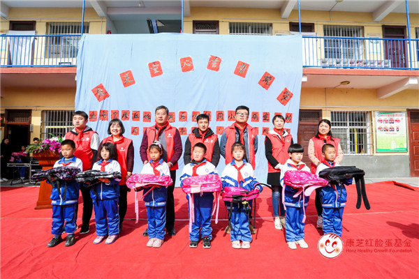 隨后,康芝藥業OTC事業部市場總監陳艷杰向延安寶塔區姚店新區小學校長屈振軍贈送了愛心共建學校牌匾,7家愛心診所的代表還給孩子們送上了書包、文具等文體用品。