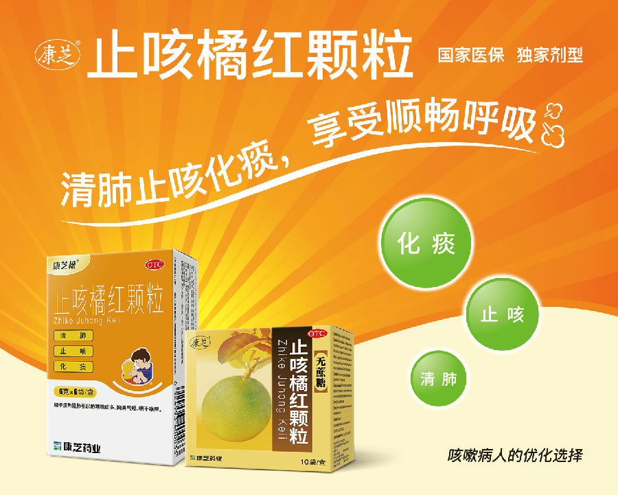 止咳橘紅顆粒為我司獨家產品,是甲類OTC 藥和中藥保護品種。源于經典名方“橘紅丸”,始創于明代,見于《古今醫鑒》,至今已有幾百年的臨床使用歷史,安全有效。本品祛痰清熱而不傷陰,清熱滋陰而不助濕生痰,表里兼治,對痰熱阻肺引起的咳嗽痰多,胸滿氣短,咽干喉癢,急性氣管-支氣管炎和慢性支氣管炎急性發作等均有獨特療效。