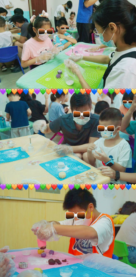 隨后,來(lái)自康芝紅臉蛋基金的志愿者們手把手指導(dǎo)孩子們?cè)趺粗谱鞅ぴ嘛灐J紫葘⒃牧媳ぴ嘛灧酆退幢壤旌希雀魑恍∨笥讯纪瓿蛇@個(gè)步驟后,志愿者們手把手教小朋友們將粉團(tuán)揉至光滑狀態(tài),再加入不同的果蔬粉,五顏六色營(yíng)養(yǎng)又健康的小面團(tuán)就揉好了,最后加入孩子們自己喜歡的餡料,放進(jìn)模具里,一只只可愛(ài)的冰皮月餅就制作完成啦!