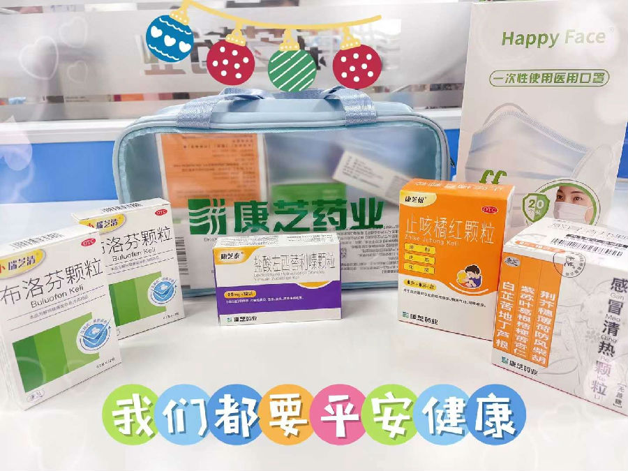 康芝防疫愛心包內含:一次性使用醫用口罩、布洛芬顆粒、感冒清熱顆粒、鹽酸左西替利嗪顆粒、止咳橘紅顆粒等常用藥品和防護物資。