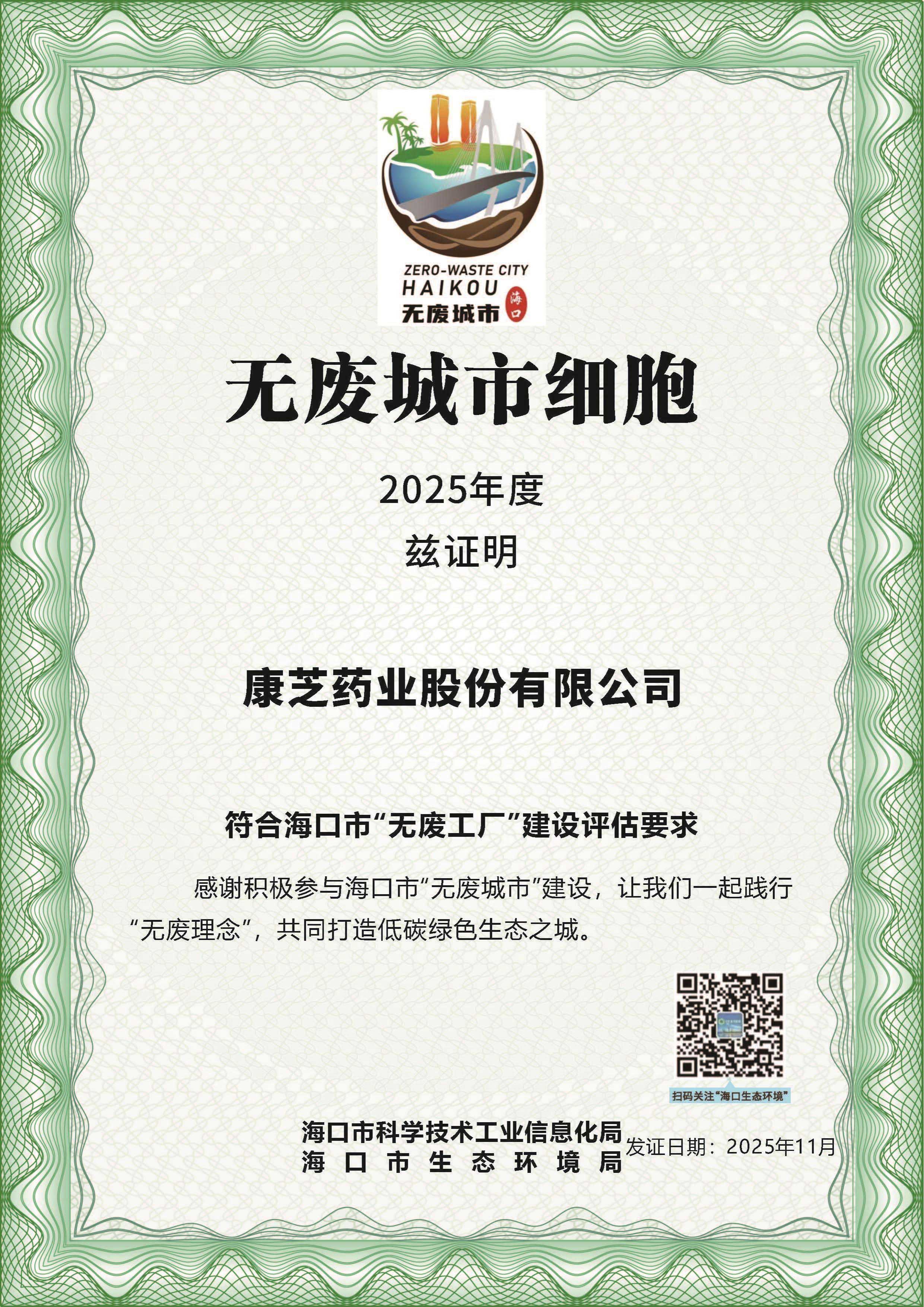 2025年11月10日,康芝藥業收到海口市科學技術和工業信息化局、海口市生態環境局聯合頒發的海口市“無廢工廠”證書。這是繼今年9月被海南省工業和信息化廳認定為“海南省綠色工廠”后,公司在綠色生產和可持續發展領域的成果再度獲得權威認可。